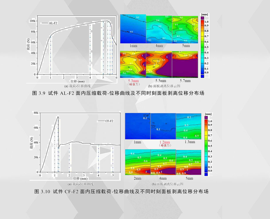 對(duì)面板材料為彈塑性材料的鋁合金夾層結(jié)構(gòu)AL-F2而言,在發(fā)生面板局部屈曲之前,剝離位移場(chǎng)的分布規(guī)律較為隨機(jī);當(dāng)曲線達(dá)到峰值載荷時(shí),面板邊緣出現(xiàn)多處局部屈曲,隨后面板與芯層之間的分離面積以及分離程度隨加載位移的增加而變得越來(lái)越大,面板的屈曲程度也越來(lái)越大,面板的承載能力顯著降低,導(dǎo)致試件整體承載能力急劇下降。對(duì)面板材料為脆性材料的碳纖維增強(qiáng)夾層結(jié)構(gòu)CF-F2而言,在峰值載荷之前,發(fā)生面板斷裂的一側(cè)邊緣先出現(xiàn)剝離位移,而另外一側(cè)剝離位移非常小,與鋁合金夾層結(jié)構(gòu)相比,纖維增強(qiáng)夾層結(jié)構(gòu)的剝離位移要小很多;峰值載荷之后,面板剝離位移分布場(chǎng)呈現(xiàn)較為規(guī)律的帶狀分布,分布規(guī)律為以斷裂處為中心,向上下兩邊緣呈帶狀擴(kuò)散;從剝離位移分布場(chǎng)可以看出纖維增強(qiáng)夾層結(jié)構(gòu)的面板斷裂方式為某一側(cè)先發(fā)生斷裂破壞。