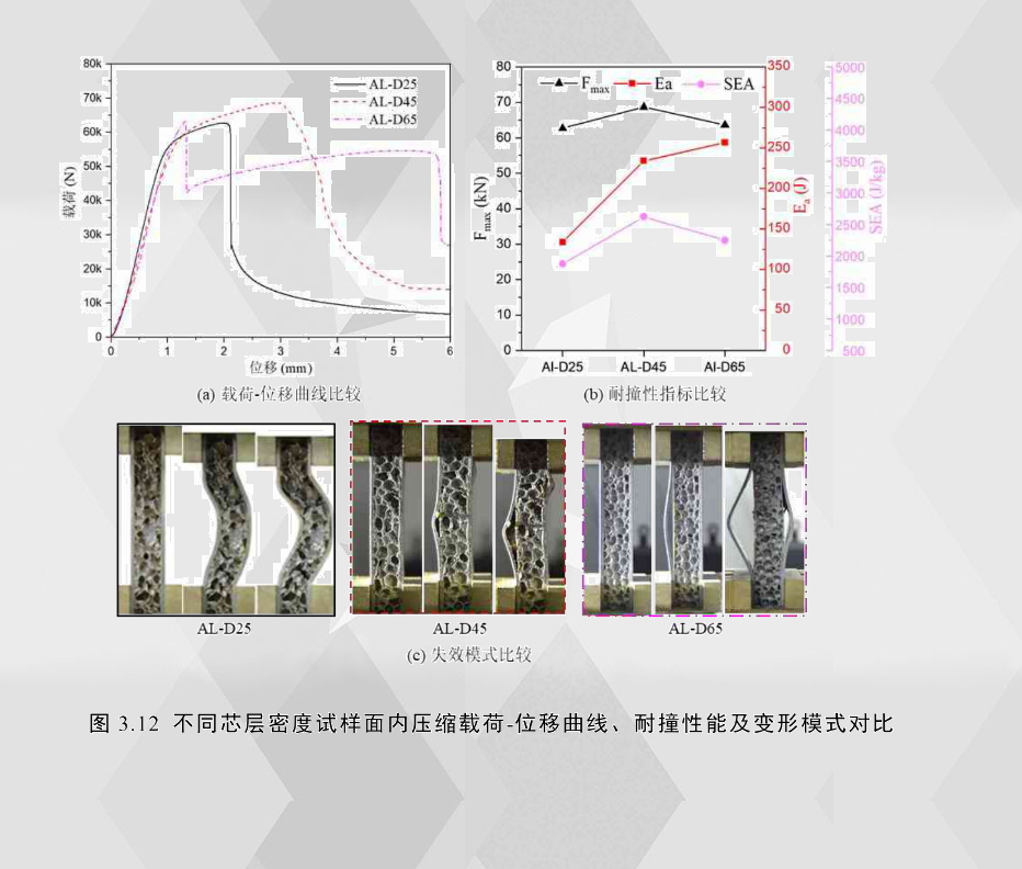 為了分析泡沫芯層密度的影響,選取芯層密度為0.25g/cm3,0.45g/cm3和0.65g/cm3的鋁合金夾層結(jié)構(gòu)作為研究對(duì)象。圖3.12(a)和(c)為三種試件的載荷-位移曲線和變形過(guò)程的比較,從圖中可以看出,其載荷-位移曲線的相似性相較大。其中AL-D25和AL-D45在第一二階段的變化趨勢(shì)基本一致,區(qū)別在于前者出現(xiàn)整體屈曲,并且芯層剪切破壞明顯,載荷出現(xiàn)斷崖式下降;而后者的失效模式以面板屈曲為主,芯層并未出現(xiàn)明顯芯層破裂,所以試件整體的仍具備相對(duì)穩(wěn)定的承載能力,雖說(shuō)載荷也出現(xiàn)大幅度下降,但其下降的坡度遠(yuǎn)沒(méi)有前者陡。對(duì)試件AL-D65而言,其載荷-位移曲線與其他兩個(gè)試件的主要差別在于第一階段和第二階段交界處附近載荷出現(xiàn)斷崖式下降,造成這種現(xiàn)象的原因是某一面板出現(xiàn)較大尺寸的屈曲,并伴隨著大面積膠層失效,此面板基本喪失了大部分承載能力,從而導(dǎo)致載荷劇減,而當(dāng)另一面板再次出現(xiàn)屈曲時(shí),載荷仍然出現(xiàn)斷崖式下降。雖然試件AL-D45也出現(xiàn)了面板屈曲現(xiàn)象,但與AL-D65不同的是,前者的兩面板幾乎同時(shí)出現(xiàn)屈曲失效,兩面板的承載能力不至于瞬間減低,雖說(shuō)承載能力有所下降,但也并未出現(xiàn)斷崖式下跌,而且AL-D45的峰值載荷對(duì)應(yīng)的位移大約在3mm,比AL-D65的1.3mm更遲,這也從另一方面解釋了前者具有更大的峰值載荷。有趣的是,雖然三者曲線相差較大,但三種試件在第一階段和第二階段的斜率是旗鼓相當(dāng)?shù)摹?/span>