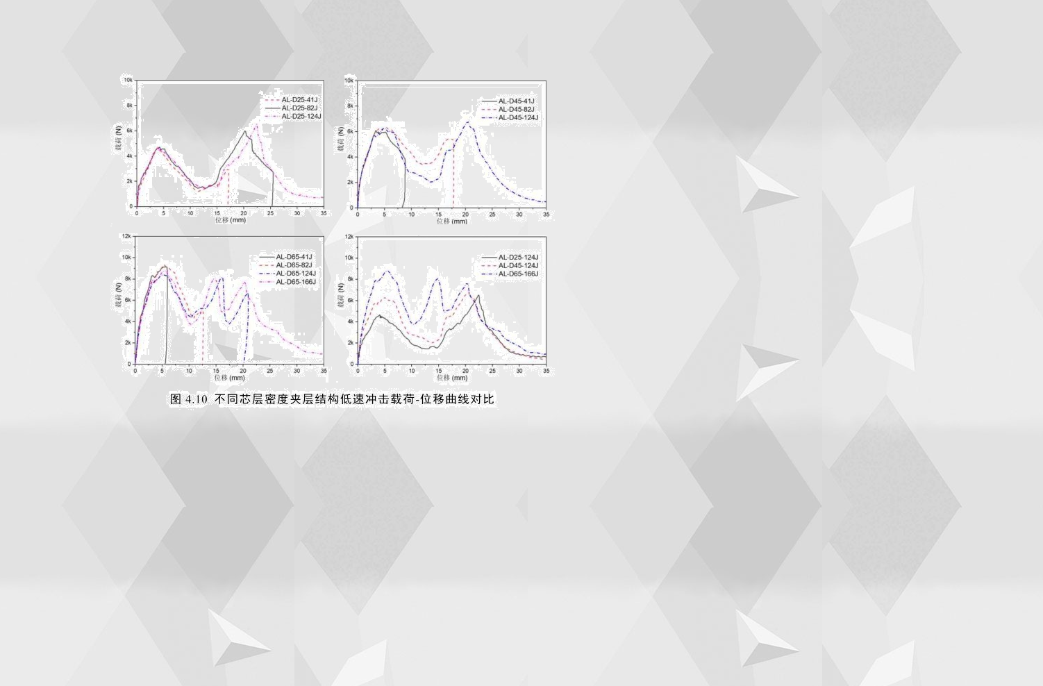 為了了解泡沫芯層對夾層結(jié)構(gòu)沖擊性能的影響,分別選擇了三種不同芯層密度和三種不同芯層高度的夾層結(jié)構(gòu)作為研究對象,需要特別說明的是,這六種配置的試件,其面板均由厚度相同的鋁合金制成。圖4.10為相同配置夾層結(jié)構(gòu)在不同沖擊能量下及不同芯層密度的試件在穿透能下的載荷-位移曲線,通過對比可以看出,當(dāng)芯層密度從0.45g/cm3增加到0.65g/cm3時,載荷-位移曲線的形式發(fā)生了很大變化,曲線的峰值載荷由兩個變?yōu)槿齻€,且曲線的波峰和波谷均隨芯層密度的增加而增加。